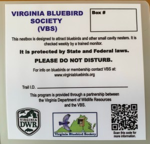 Our nest boxes, poles, and guards are provided by the Virginia Bluebird Society. The predator guards to minimize the chance that cats, house sparrows, snakes, squirrels, raccoons, and raptors will prey on the eggs and nestlings. The Noel guard on the front prevents predators from reaching into the box. The guard on the pole is a snake guard that blocks snakes from getting up the pole. The nest boxes are protected by State and Federal laws.
